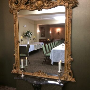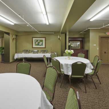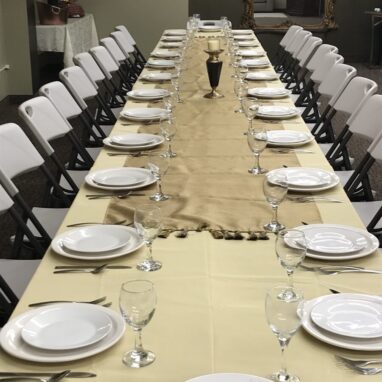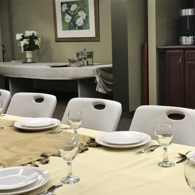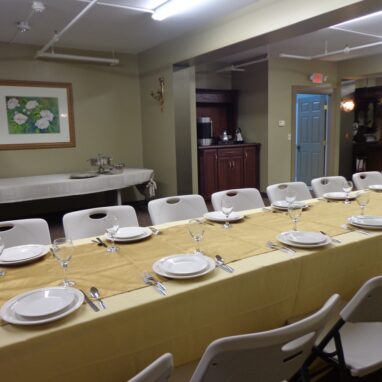 Enjoy this comfortable cozy room with a catering station and steps away from the prep kitchen. Table and chairs provided.